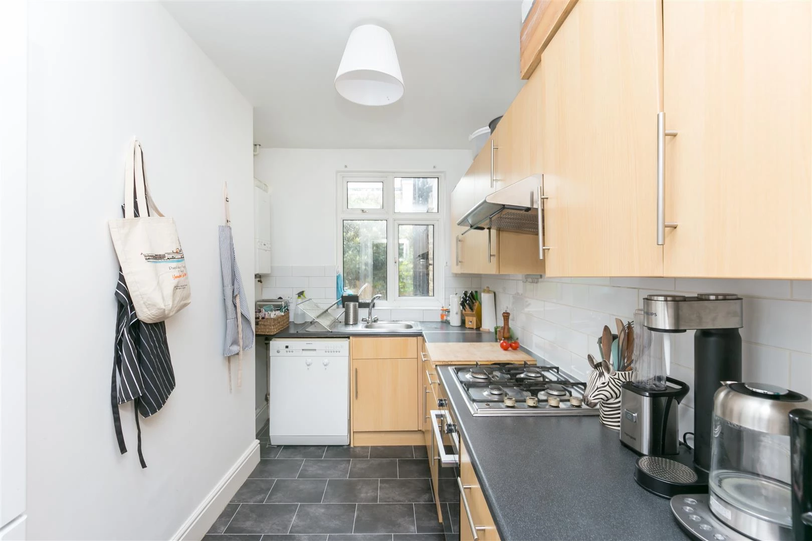 Accessed via its own front door, a welcoming hallway leads into a bright, semi open-plan kitchen and living space. The living area is neutrally decorated and features high ceilings and a large bay window, creating an airy, inviting feel. To the rear, the L-shaped kitchen offers ample cupboard and worktop space, fitted appliances, a tiled splashback, and a window overlooking the quiet rear aspect.