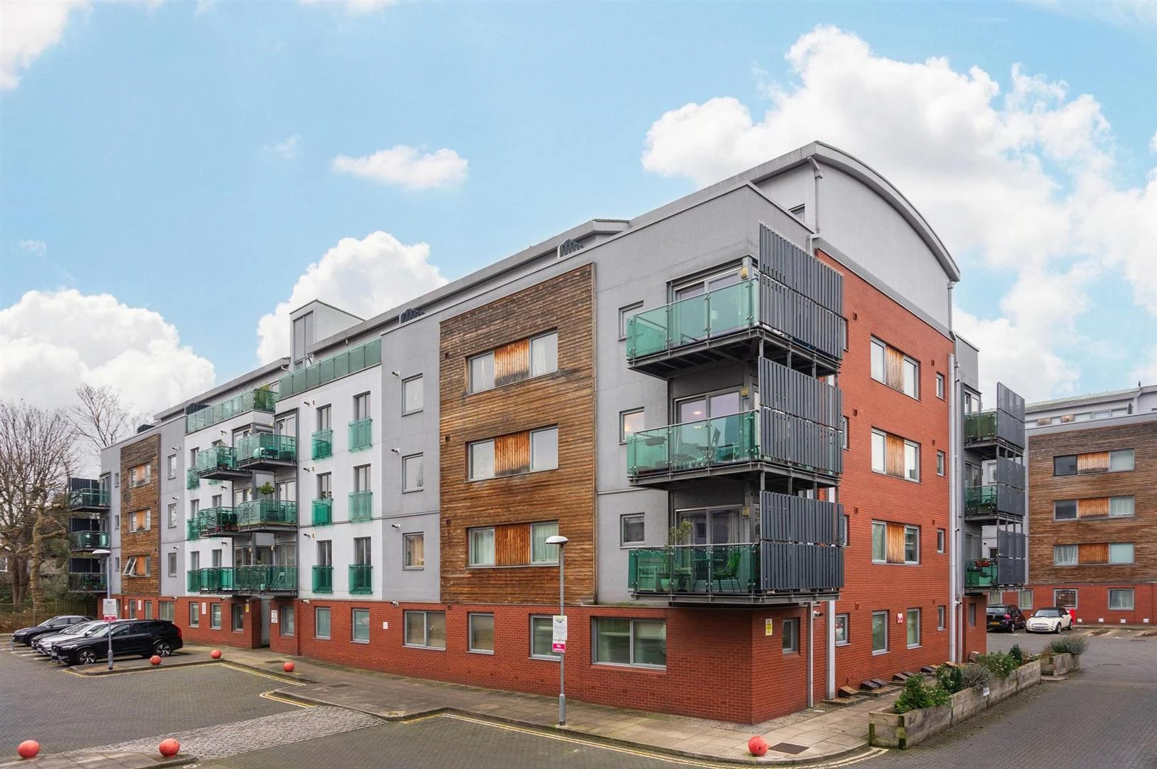 The apartment features a generously proportioned double bedroom with a built-in wardrobe, a contemporary family-sized bathroom, and an open-plan kitchen-living space. The kitchen has been thoughtfully modernized and includes a small breakfast bar. The spacious adjoining living area is perfect for unwinding, leading to a delightful south-facing wrap-around balcony that provides tranquility away from the street. Furthermore, the property includes a private allocated parking space secured with a bollard.